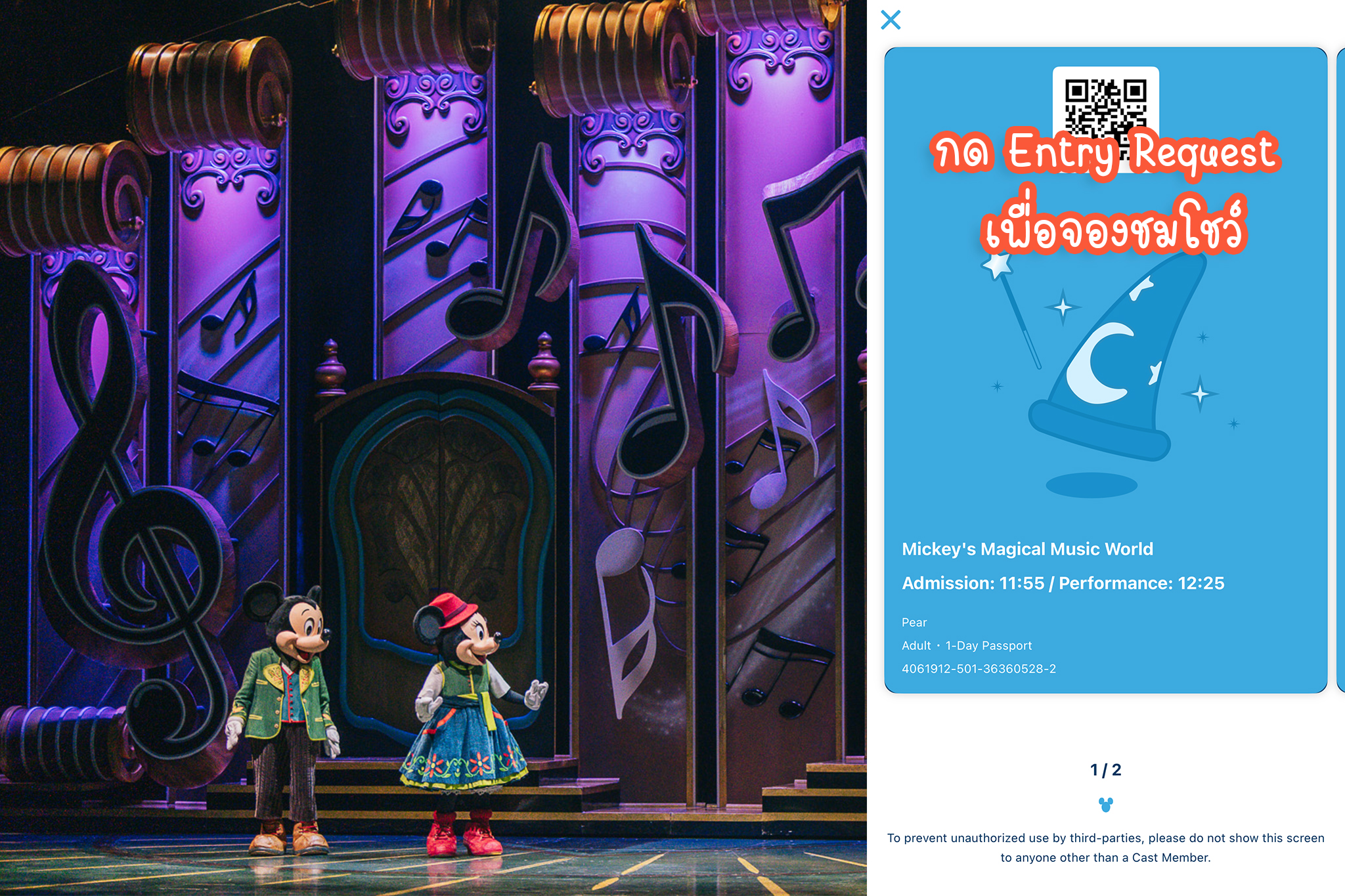 หน้าตัวอย่างบัตร Entry Request เพื่อเข้าไปดูโชว์ Mickey's Magical Music World แนะนำมากๆ ควรแวะไปดู (โชว์คล้ายกับ Mickey's Storybook Adventure ของเซี่ยงไฮ้และฮ่องกง แต่มีตัวละครต่างกัน)